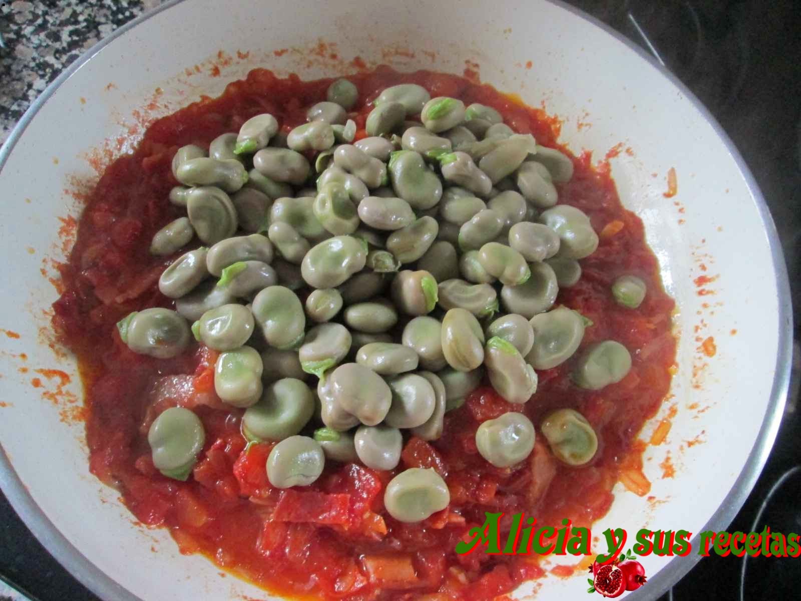 tomate, añadimos las habas (sin el caldo) y rehogamos dos o tres minutos.